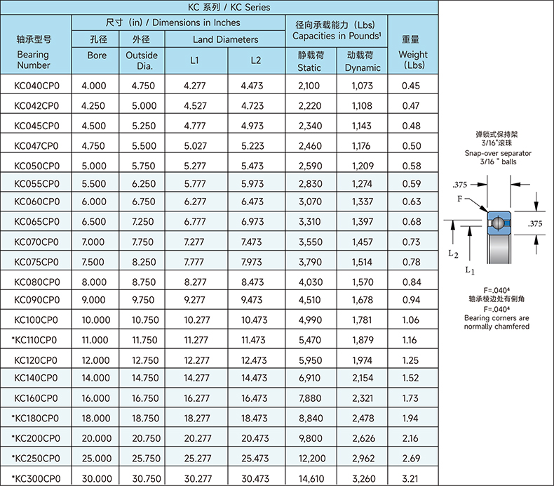Specifikace ložiska Kaydon KC047CP0 je následující:
